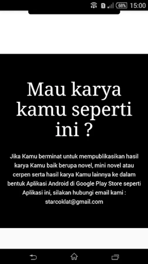 If you are interested in publishing your work in the form of novels, mini novels or short stories as well as your other works in the form of Android applications on the Google Play Store like this application, please contact our email: starcoklat@gmail.com