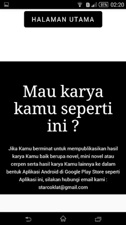 If you are interested to publish the results of your work in the form of novels, mini novels or short stories and other works Looking into the form of Android app on Google Play Store like this application, please contact our email: starcoklat@gmail.com
