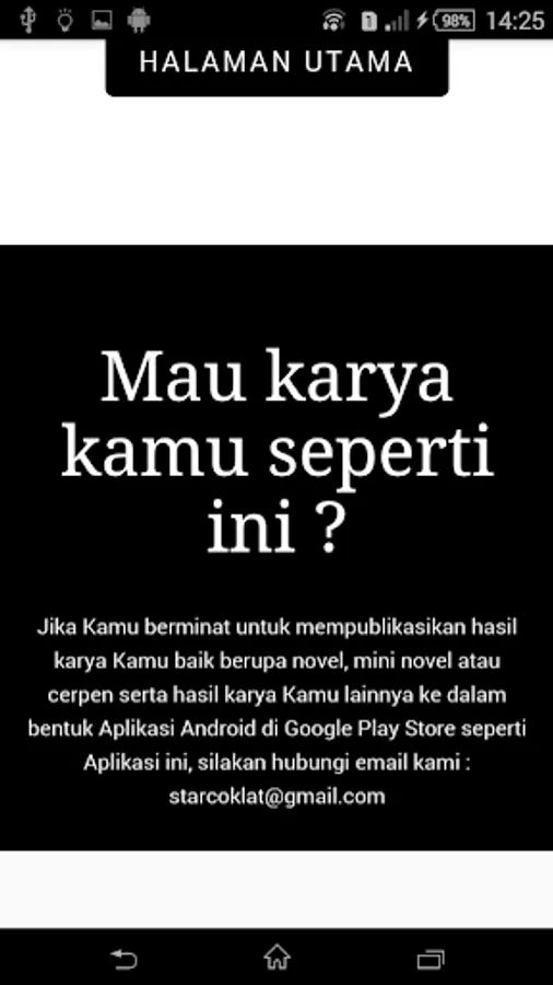 If you are interested to publish the results of your work in the form of novels, mini novels or short stories and other works Looking into the form of Android app on Google Play Store like this application, please contact our email: starcoklat@gmail.com