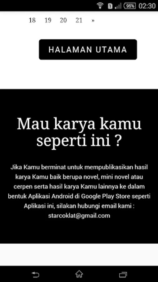 If you are interested to publish the results of your work in the form of novels, mini novels or short stories and other works Looking into the form of Android app on Google Play Store like this application, please contact our email: starcoklat@gmail.com