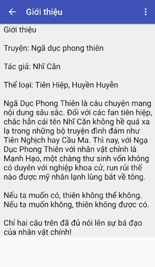 Ứng dụng đọc truyện tiên hiệp "Ngã dục phong thiên" gọn nhẹ, đơn giản, nhiều tùy chọn chế độ đọc, phù hợp với nhiều đời máy.