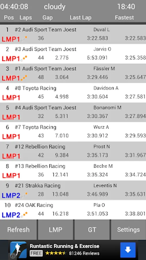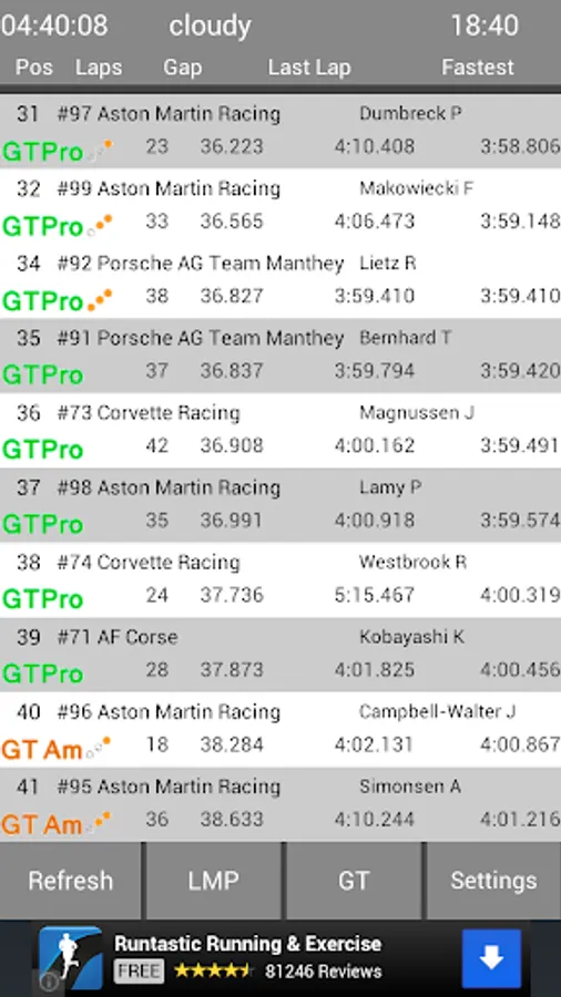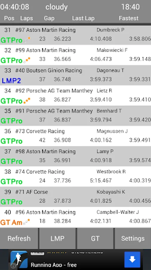 This is a very simple, but effective Live Timing App for the Le Mans 24 hours and FIA World Endurance Championship (WEC). It has been developed with speed and lightweight data use in mind. It displays the race position, name of the entry, driver, class, number of laps completed, gap, last lap and fastest lap.