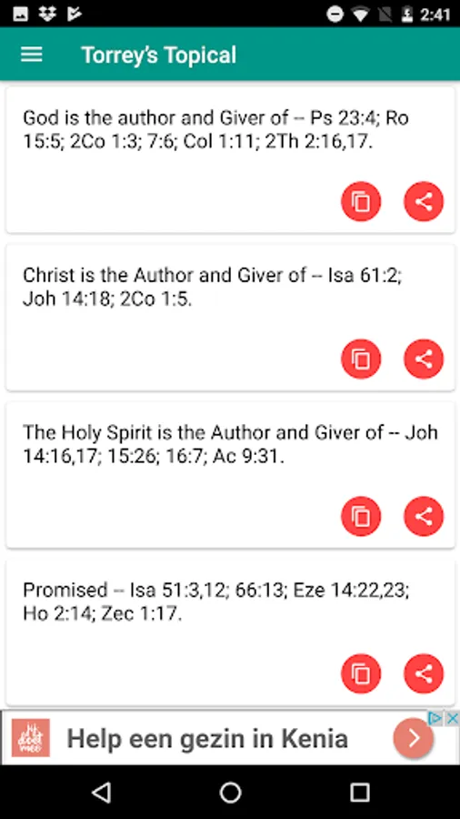 Torrey’s Topical Textbook app is a helpful tool containing an alphabetical index of topics found in the Bible along with its Scripture references. It can help you gain insight and perspectives as you study the Word of God as well as help you locate specific Bible verses that you forgot the chapter or verse.