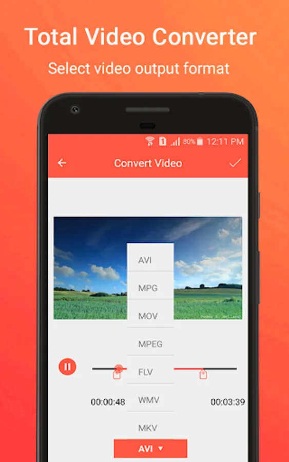 - Total Video Converter allows you to select convert format such as 3gp, mpeg, mp4, flv, avi, mov, mpeg, wmv.