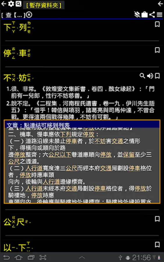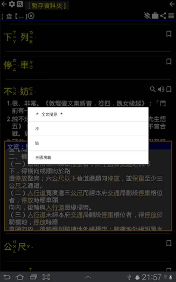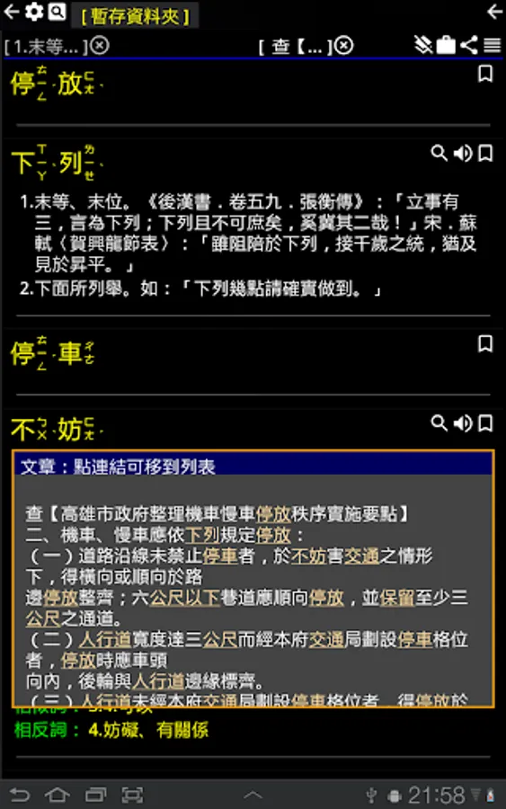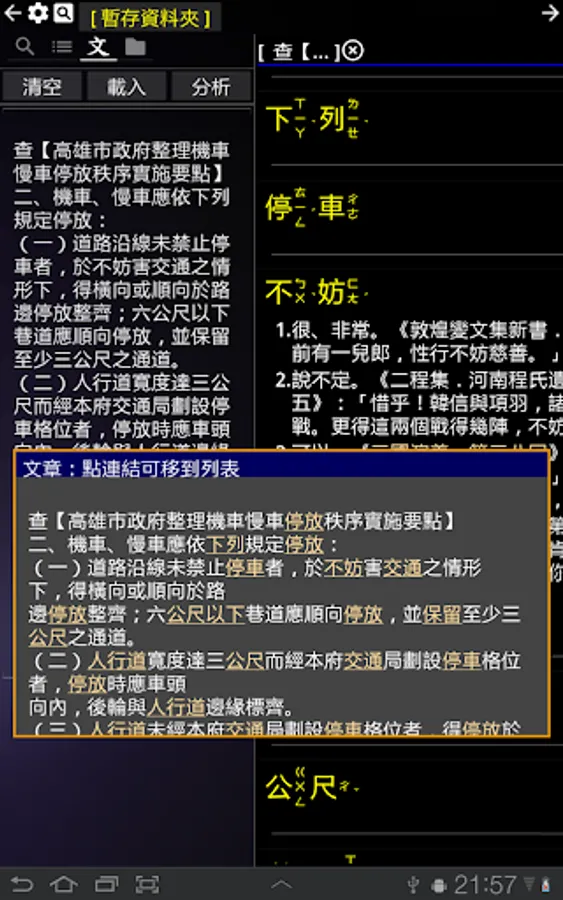本軟體獨家功能之一,可以分析一整篇文章,例如一篇課文,一則新聞,一段文章等等,您可以自行輸入,也可以從 SD 卡載入,將文章內容的相關的條文通通找出來,並收錄於資料夾中。
