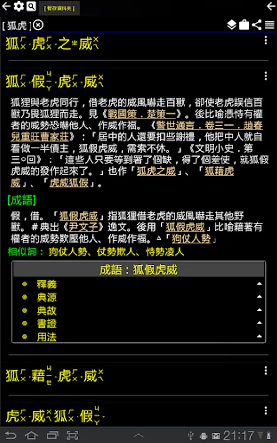 例如:【狐虎】→【狐虎之威】【狐假虎威】【狐藉虎威】【虎威狐假】。