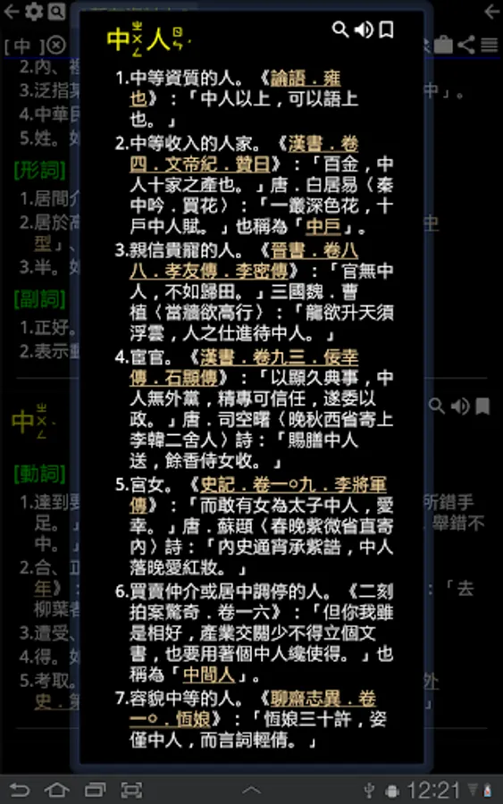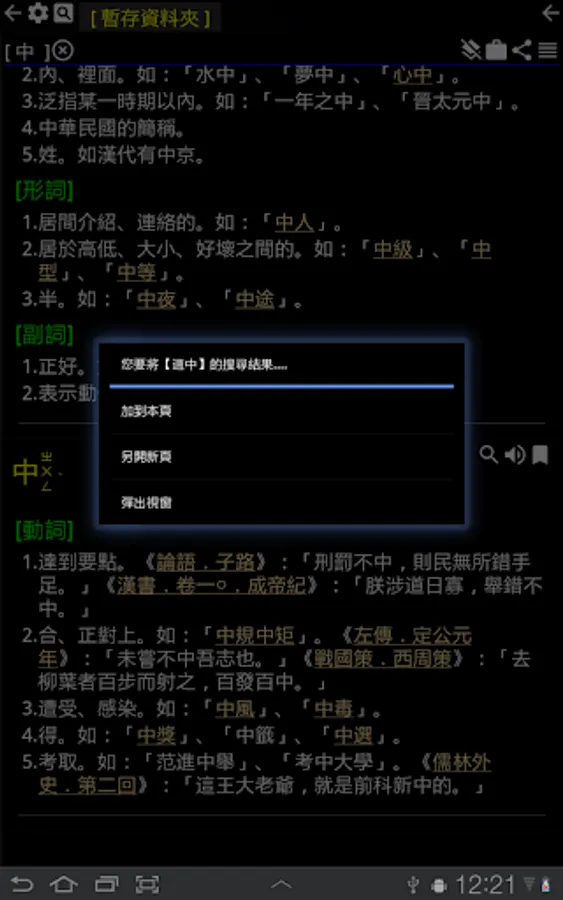依教育部提供之【重編國語辭典修訂本】與【成語典】編成,總條目約20萬條,除【注音】【部首】【筆劃】基本的字詞查尋功能外,我們另外提供【字】【詞】【句】【文章】等搜尋,輔以強大的【課文劉覽】模式,與【即時解譯】的隨看隨查功能,提供【分享】讓您能印出講義書藉,提供【自訂釋義】加以進一步編修條文,多樣專業化的功能,是您編輯教育讀本的好幫手