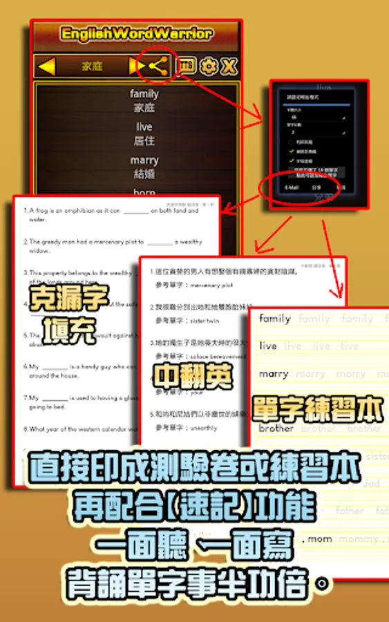 7.提供【輸出句型測驗卷】功能,輸出成測驗卷本,有克漏字與中翻英,隨機出題,可直接列印讓初學者測驗,瞭解學習進度。