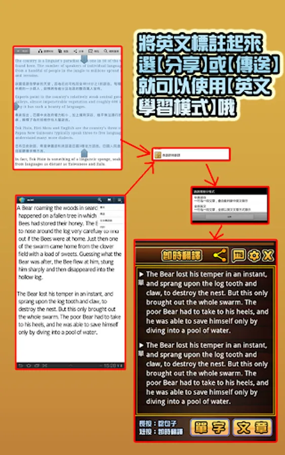 在網頁、PDF檔,或其他軟體,或有不錯的英文教材要分享給學生時,或閱讀英文需要即時單字翻譯時,您可以將需翻譯的部份標註下來,點【分享】【英漢翻譯】,即會以【文章模式】顯示,並可使用【文章模式】的所有功能,讓您聽故事,唸句子,讀文章,寫單字,英文能力三級跳。