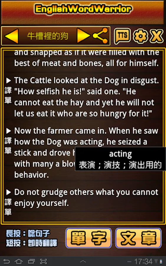 2.短按文章列長中的單字時,會顯示單字的【即時翻譯】;長按時會唸【整句英文】