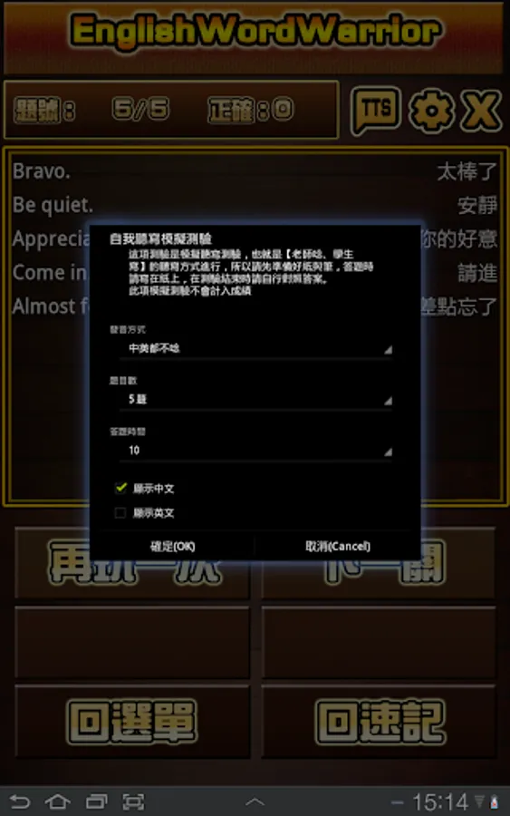 1.可選擇中翻英、英翻中、聽力翻英、聽力翻中四種