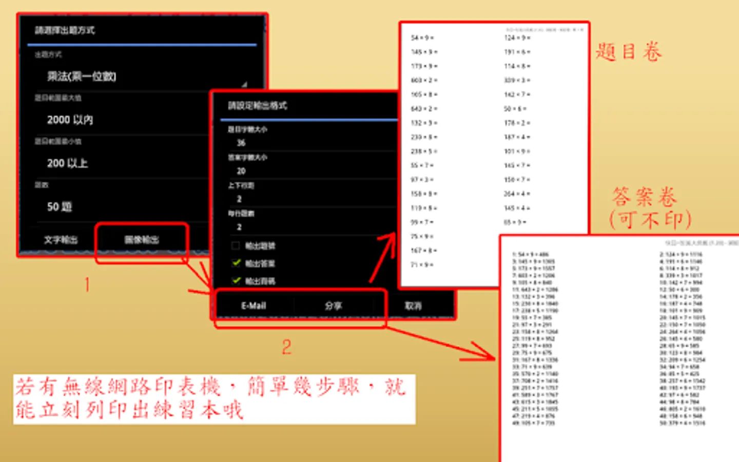 若有無線網路印表機,您就可以直接輸出試題與答案,點選主畫面【輸出】【自訂輸出】,設定好題目選項後,點【圖像輸出】,設定好輸出樣式後,點【分享】,再選擇您已安裝的印表機即可,也可以選擇用 E-Mail 或其他方式分享哦。