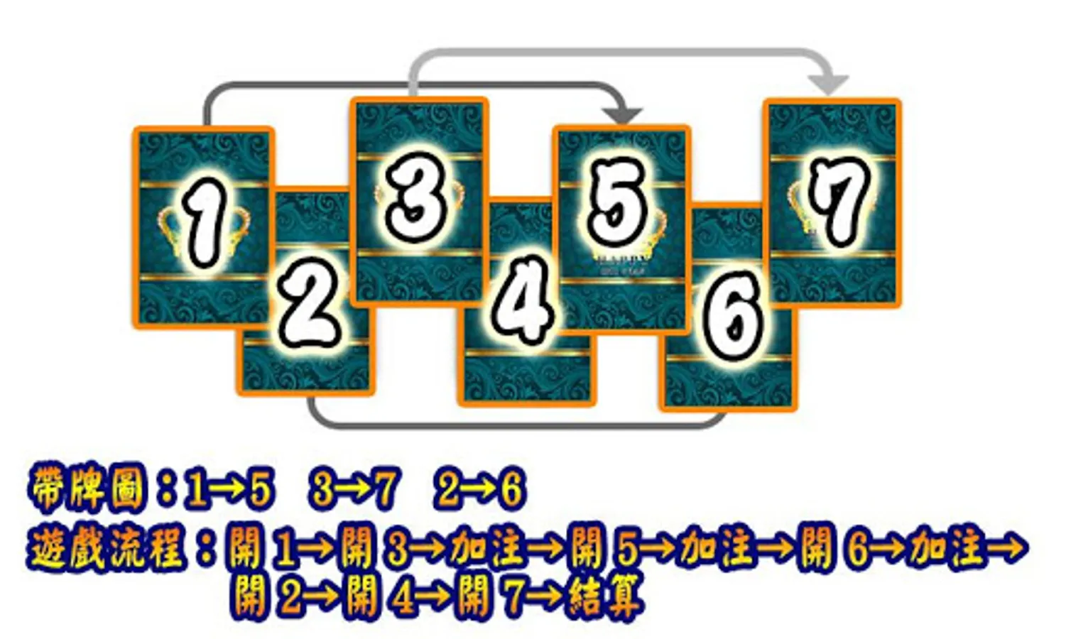 Game process: turn the first card turned a third card → → → turn first raised the fifth card → → turn raises the second sixth card → third → turn raises the remaining cards → settlement.