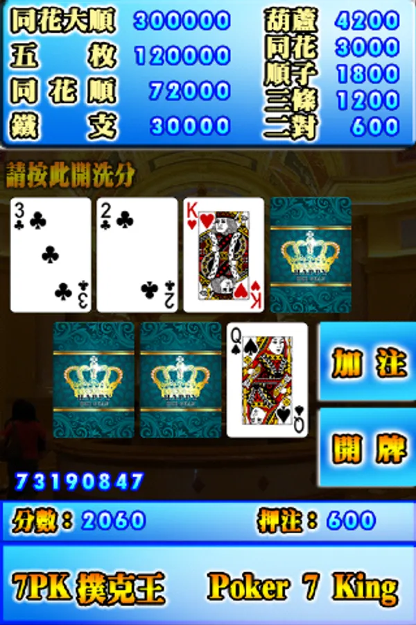 7PK charm is that there are formulas to follow, the Board issued to the seven cards, the first three cards can predict what will be after three cards, in addition to the opportunity to raise the basic injection three times, the player can be Try the next one or two note water temperature, and then daring to meet favorable situations shoved after a familiar gameplay can really achieve good fortune, the more play the more policy-type poker game started.