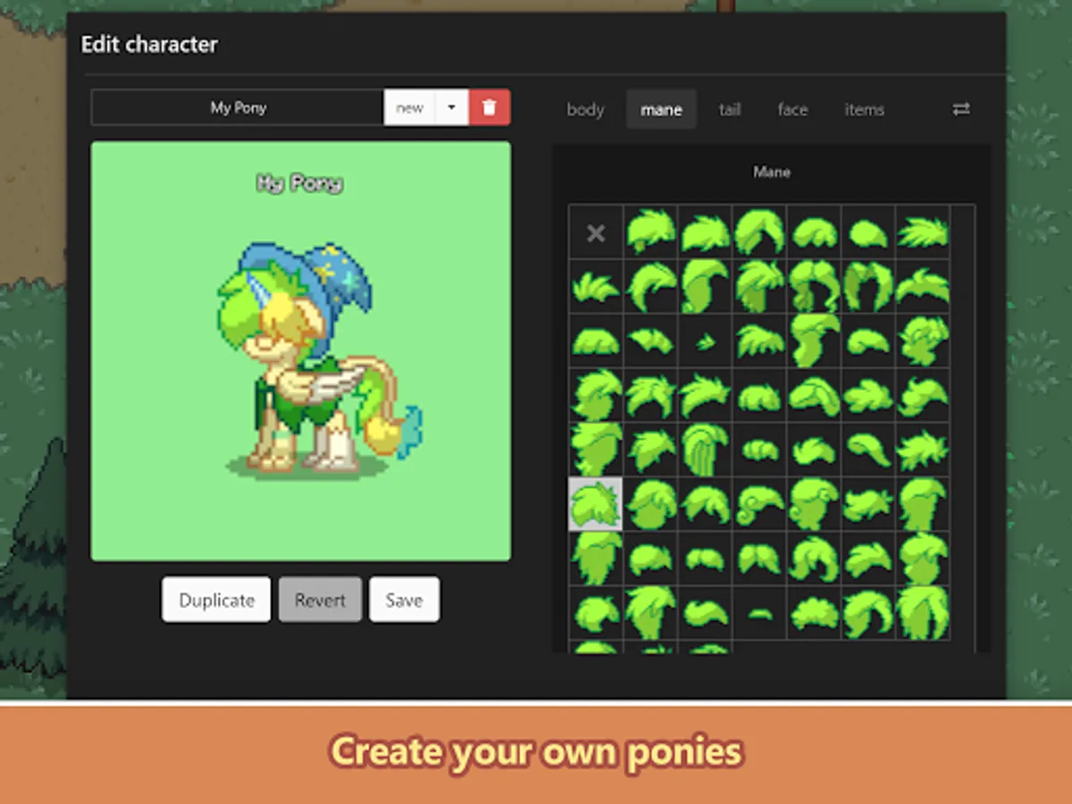 Create ponies with unicorn horns, pegasus wings, and various mane and tail styles. Or turn it into your own unique species by adding parts such as claws, fish tails, dragon wings, or fangs. Make your creation feel just right with various clothing and accessories to top it all off. Thanks to the ever-expanding list of available character customizations, the only limit is your own imagination!