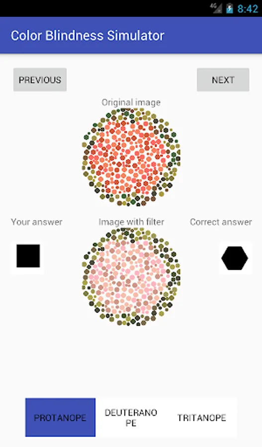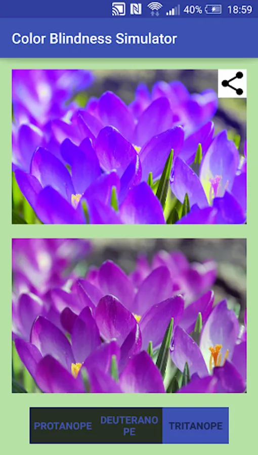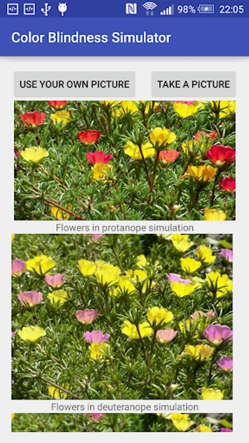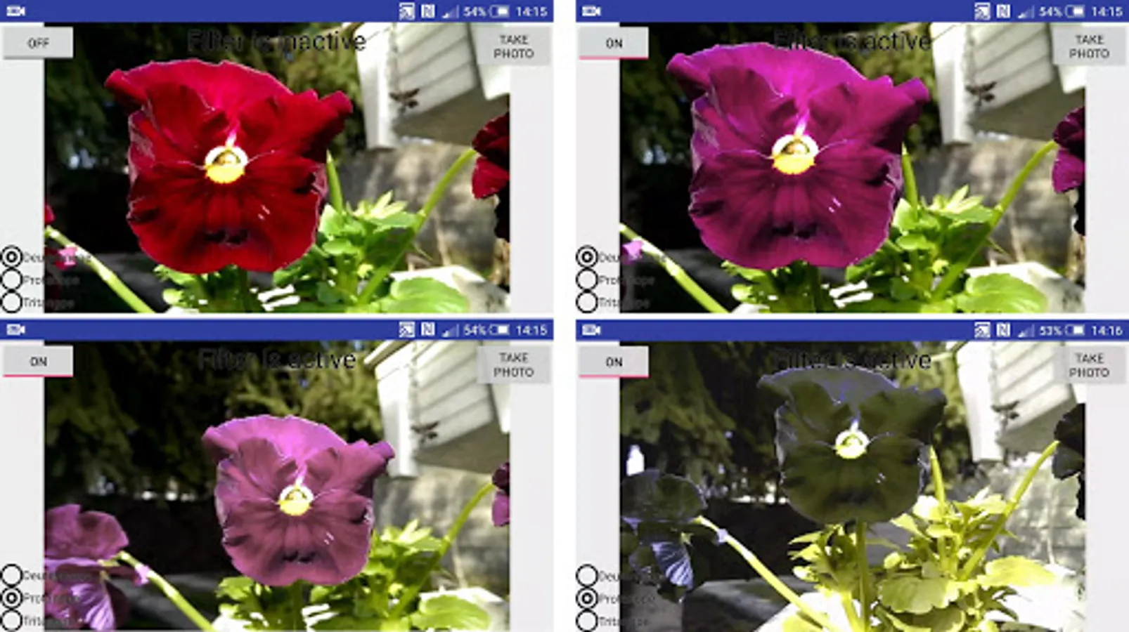 Simulation on still images, and on your device camera live view (this shows how color blind people would see that image/live view);