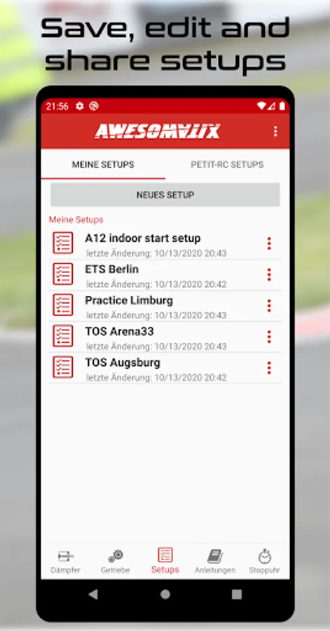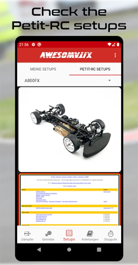 Have a quick look at offline manuals of your Awesomatix car or calculate your gear ratio and shock setup. Check the team driver setups on Petit-RC or create, share and copy your own setup sheets. Additionally, the Awesomatix Toolbox features a stopwatch to time your practice laps or full runs.
