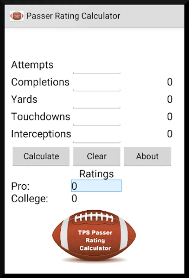 This application calculates professional and college passer ratings for the stats given - Always free! This uses the standard formula as of the date of publication.