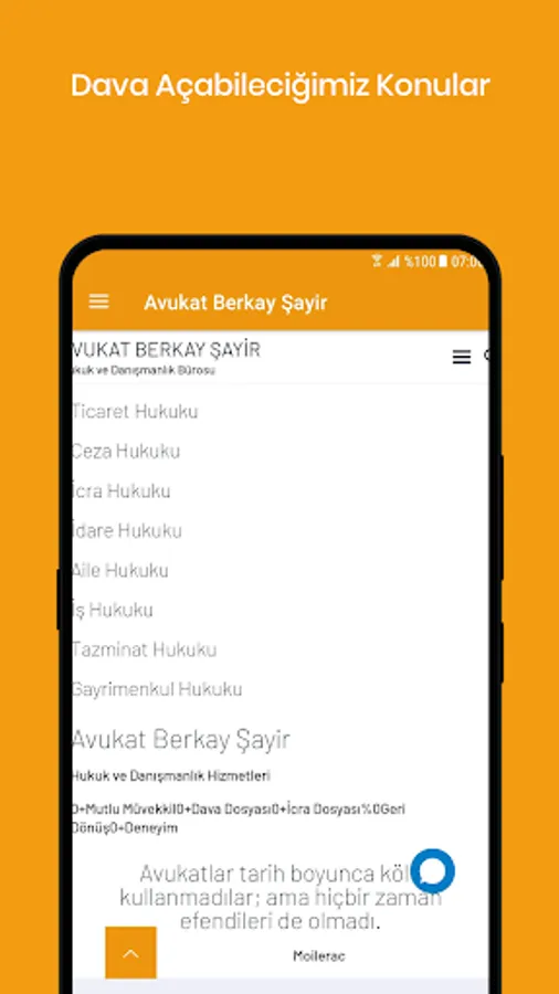 Attorney Berkay Şayir Law Firm, which he is the founder of, generally operates in criminal law, labor and social security law, administrative law, commercial law, compensation law, real estate law and family law (divorce, alimony, etc.). They also deal with compensation cases related to malpractice and work accidents. Although the office is named after the founder Berkay Şayir, many lawyers, each of whom are experts in their fields, also provide legal and technical support in office work. It should be added that many citizens who are in search of a Izmir lawyer provide uninterrupted service.