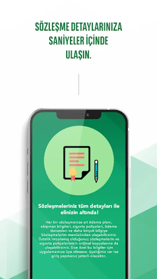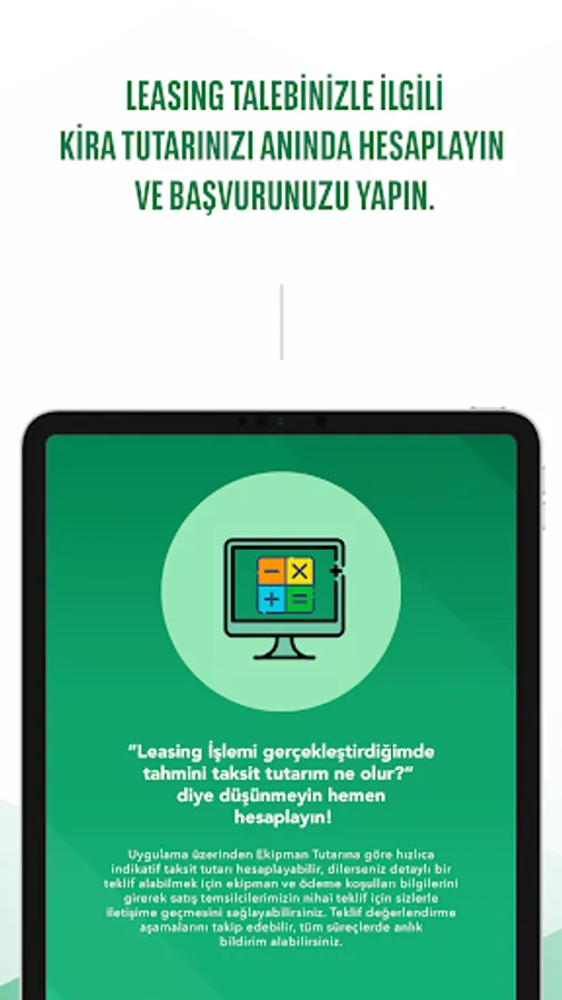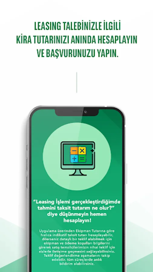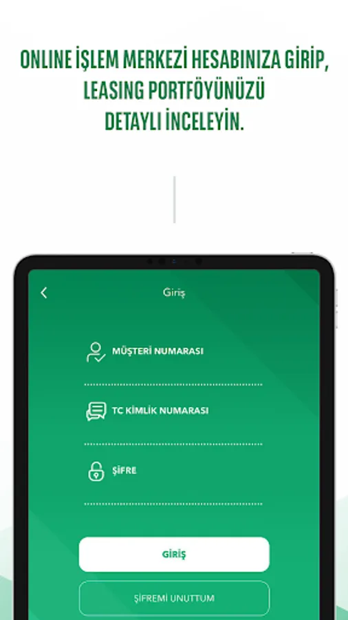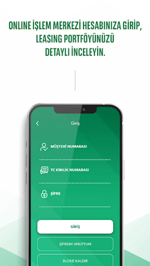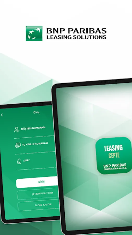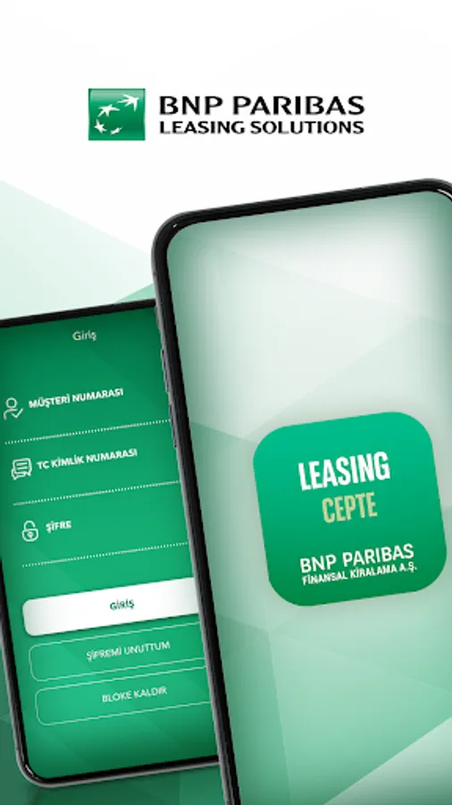 LEASING CEPTE, BNP Paribas Finansal Kiralama A.Ş. tarafından, 7-24 kolay ve hızlı bir şekilde en iyi leasing hizmetini vermek üzere siz müşterilerine özel olarak geliştirildi. Mobil uygulamamız üzerinden tüm müşterilerimiz istedikleri ekipman için leasing teklif başvurusu yapabilir, 2. El Ekipman portföyümüzü inceleyerek fiyat tekliflerini iletebilir ve aynı zamanda BNP Paribas Finansal Kiralama A.Ş. hakkında en güncel bilgilere ulaşabilirler. Aynı zamanda, BNP Paribas Finansal Kiralama A.Ş. müşterisi iseniz sizlere sağlanan uygulama giriş bilgileri ile leasing işlemlerinize ait tüm detayları takip edebilir, sözleşme detaylarınıza erişebilir, cari işlemlerinizi gerçekleştirebilir ve işlemleriniz hakkında anlık bildirimlerle bilgi sahibi olabilirsiniz. Online İşlem Merkezi yeni kullanıcısı olmak isteyen gerçek ticari müşterilerimiz uygulama üzerinden üyelik işlemlerini gerçekleştirebilirler.