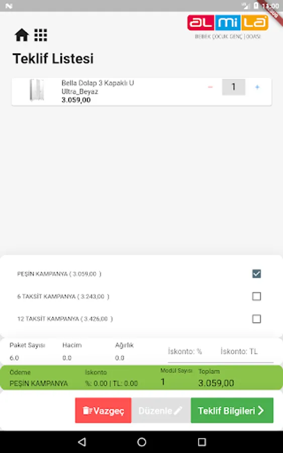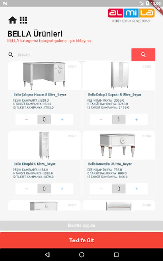 It is the application where you can reach the prices of Almila Furniture products in installments. Users who want to purchase products in the application content can access price information, as well as users who log in to dealers can create offers.