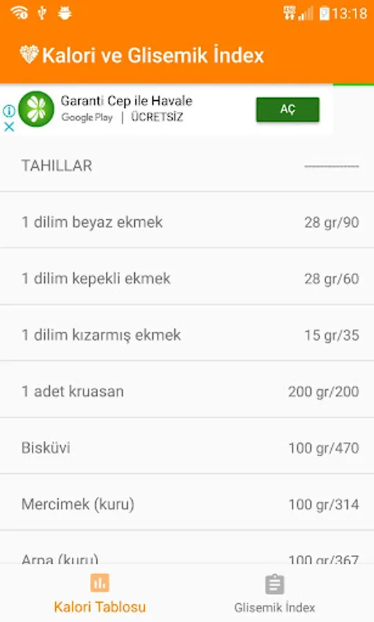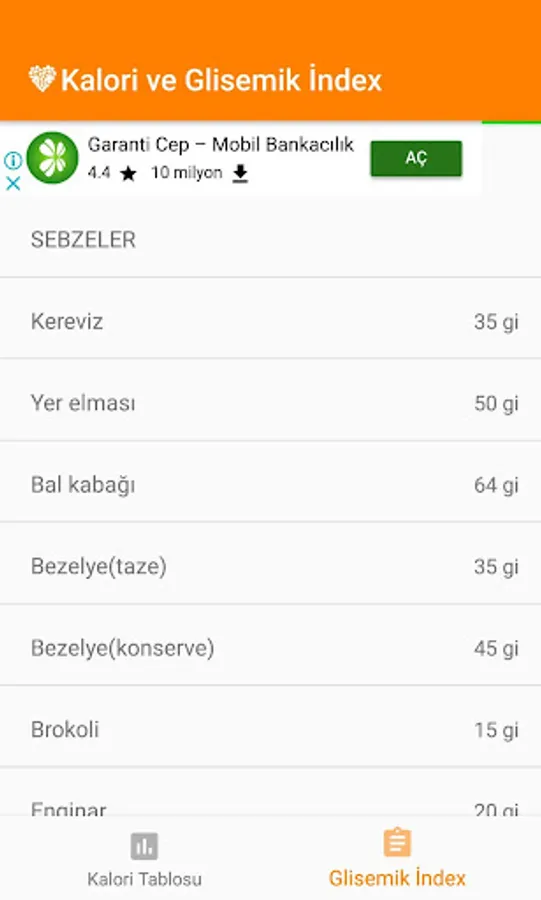 Android application that does not require internet to reach calories and glycemic index values of the foods we consume during the day