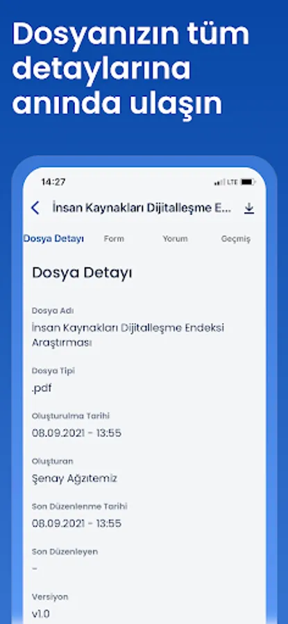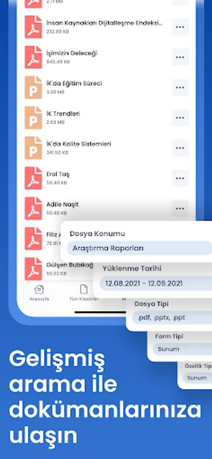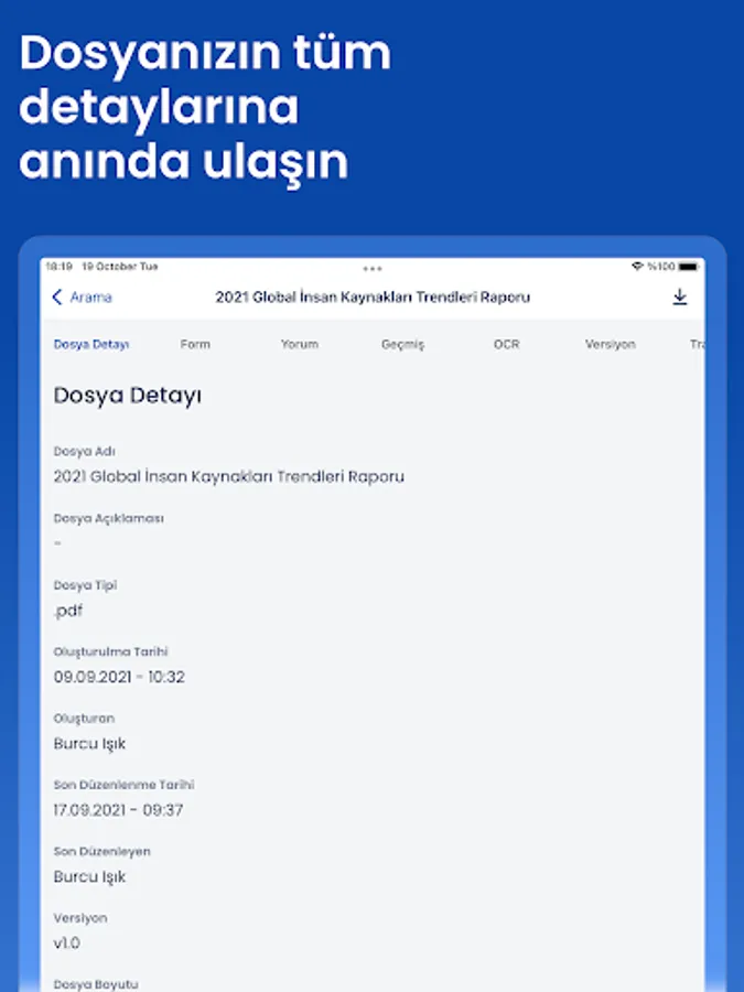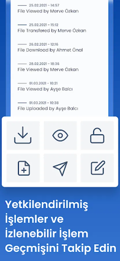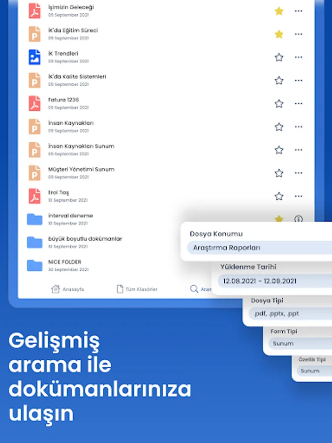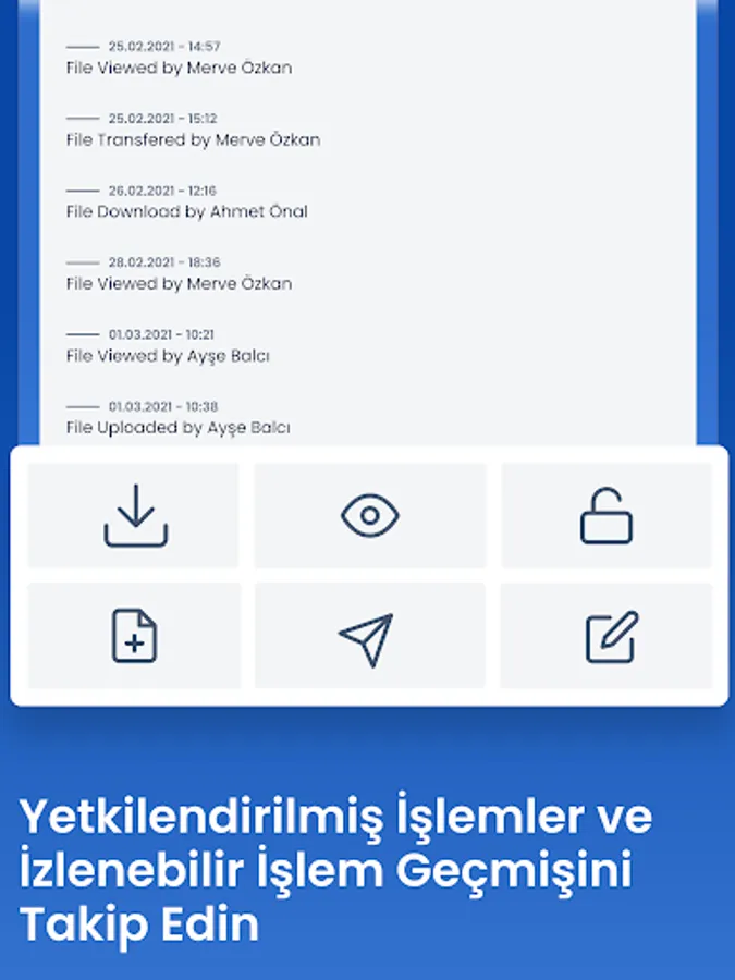 Documents are categorized by folders defined in the application. Folder and document authorizations are managed with permissions. Documents are uploaded to the system as single/multiple or scanned. The changes you make on the document are followed by the versions. It accelerates access to documents with its advanced OCR (Optical Character Definition) feature and detailed search function. With the transfer feature, documents are shared securely with users inside and outside the system. Every process made through the application can be tracked.
