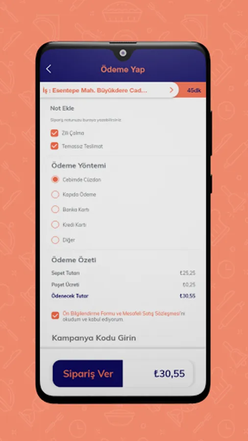 With the Cebimde application, you can use contactless delivery or ring the bell. In addition to these advantages, if you want a payment option, you can pay with cash at the door or with a credit card at the door.