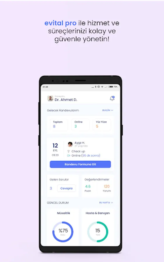 Eczacıbaşı Evital is the new health ecosystem for individuals, healthcare professionals and healthcare providers seeking healthcare solutions. Eczacıbaşı Evital, which sets out with the aim of being the pioneer of transformation in the health sector, is with you to effortlessly manage your services and processes with the evital pro mobile application special for health professionals!