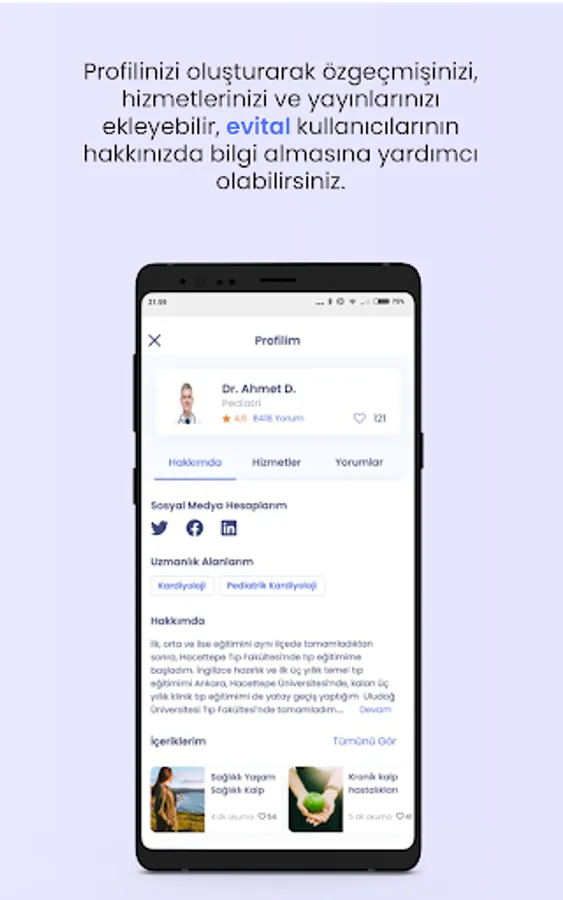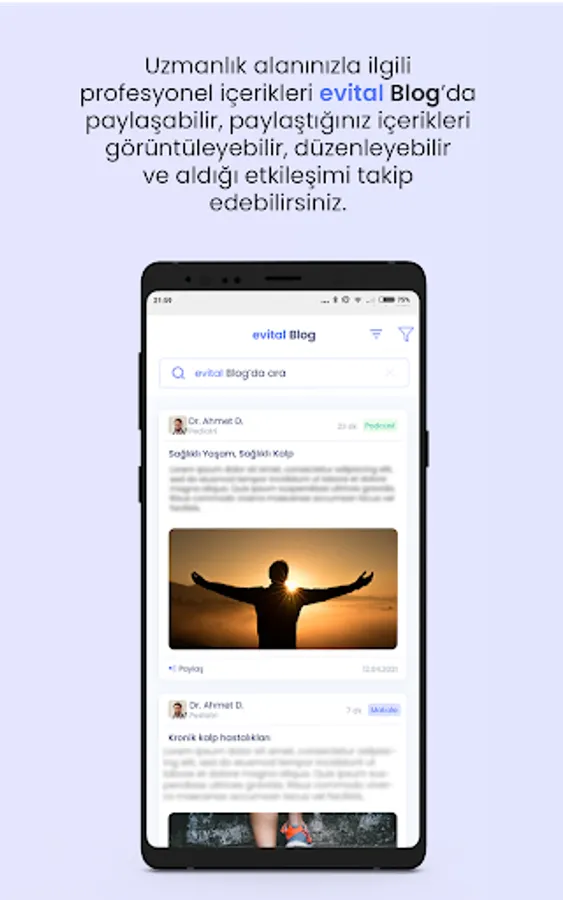 • You can share professional content related to your field of expertise on evital Blog, view and edit the content you share and follow the interaction it receives.