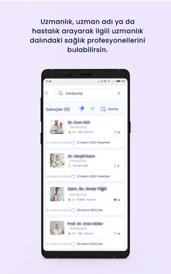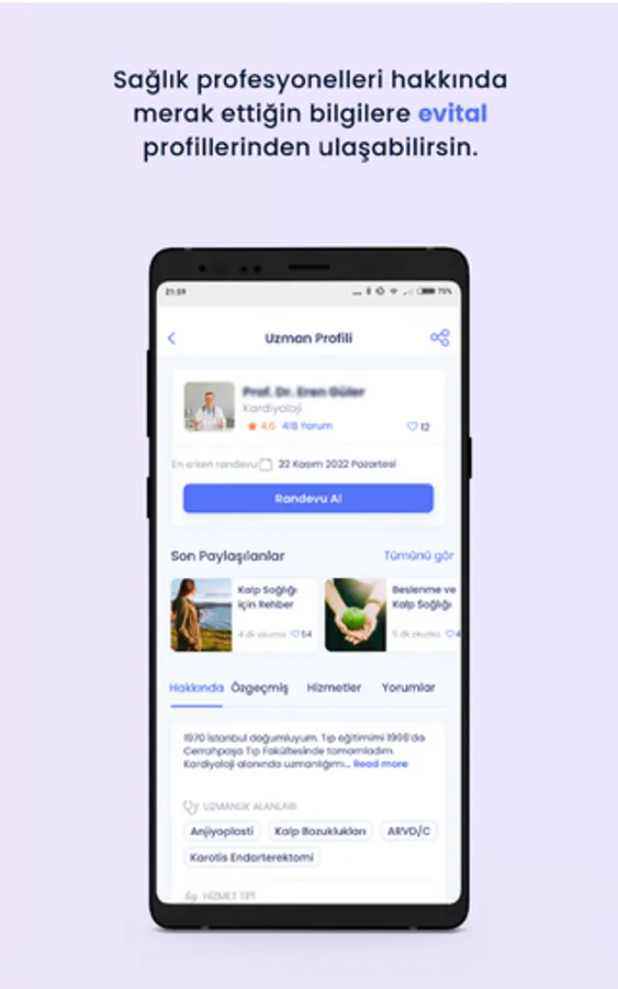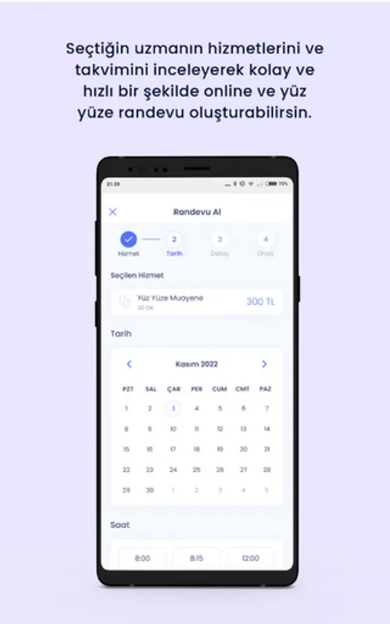 You can reach doctors and health professionals (dietician, psychologist) who use the evital platform in the relevant branches, you can choose the most suitable time period for you by examining the calendar of the specialist you have chosen, and you can make an online or face-to-face appointment easily and quickly whenever you want.