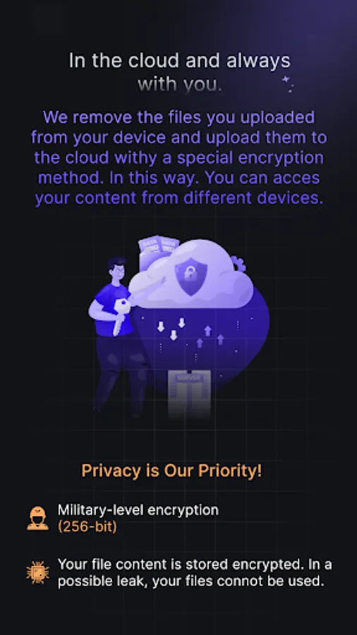 Easily store your files in the cloud using 256-bit encryption technology, and access them from anywhere in the world whenever needed. It also ensures the protection of your files in case of device loss or similar situations. After uploading to the cloud, you can choose to delete the file from your device to free up space.