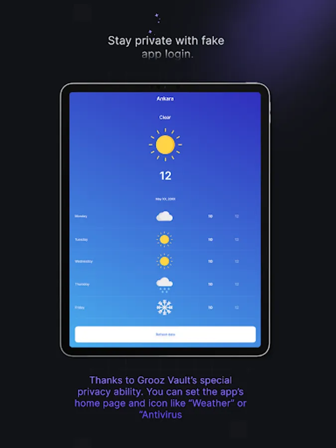 If you wish, you can change the icon and name of the Grooz Vault app to something like a weather, calculator, or antivirus app. This allows the app to go unnoticed. When you tap on it, you will still be greeted with the usual Grooz Vault login.