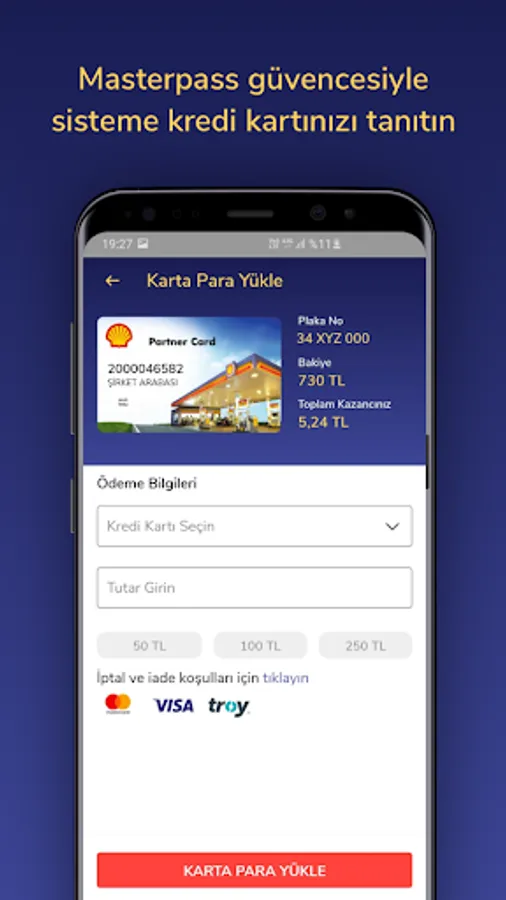 For your security, OTP or 3D security code is sent to your mobile phone from the relevant bank in every transaction. You can follow the uploaded amounts on the Shell Card detail screen.