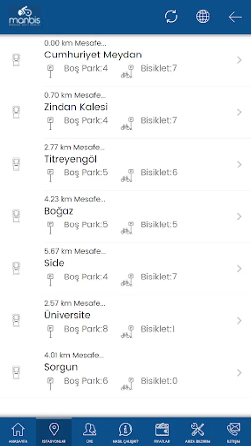 2. The stations menu lists the stations according to their proximity to you. You can see the distance between you and the station, the number of bicycles and free parking at the station and you can ask for directions.