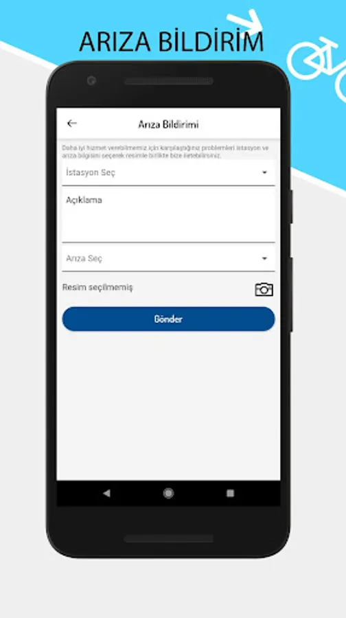 9- You can send the faults to us by clicking the Fault notification button from the menu tab, selecting the station, selecting the type of fault and adding a photo from the camera.