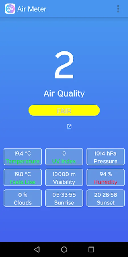 Breathe easy with Air Meter, your comprehensive app for tracking air quality and pollution levels right where you are. Stay informed and make informed decisions about your outdoor activities with real-time data on UV Index, temperature, humidity, air pressure, cloud data, visibility, sunset, and sunrise.
