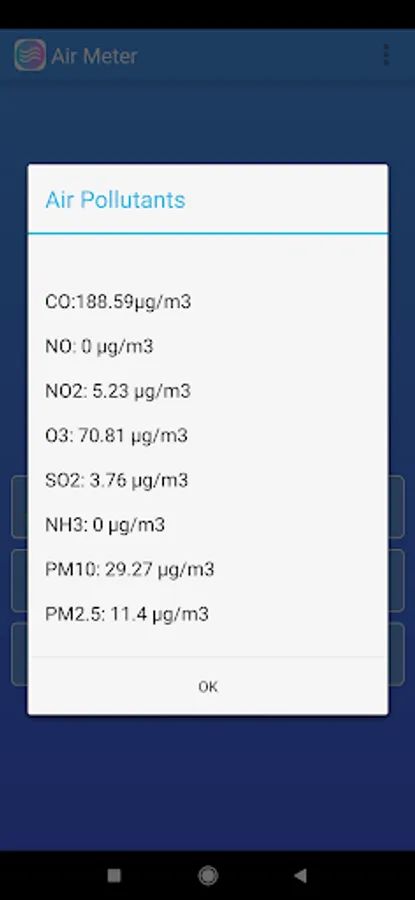 • Detailed Air Pollutant Information: Dive deeper into air pollutant data with precise measurements for carbon monoxide (CO), nitrogen monoxide (NO), nitrogen dioxide (NO2), ozone (O3), sulphur dioxide (SO2), fine particles matter (PM2.5), coarse particulate matter (PM10), and ammonia (NH3). Clear red and green indicators signify pollutant levels above or below limits.