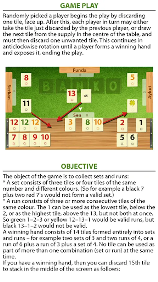 Banko Okey is popular Turkish game of the Rummy family ( known as Rummikub ) played with a set of 106 tiles. The object is, by drawing and discarding tiles, to be the first to form a hand that consists entirely of sets of equal numbered tiles, and runs of consecutive tiles of the same colour.