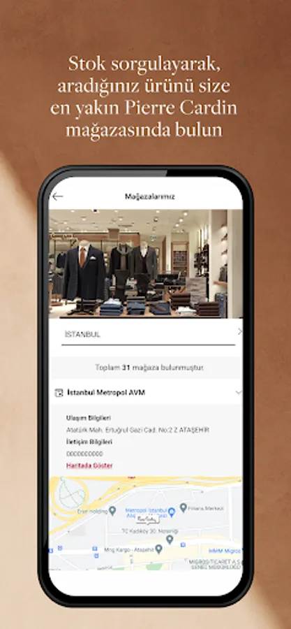 You can find the product you are looking for in the nearest Pierre Cardin store by querying the stock, and you can easily reach the store with information such as phone number and directions.