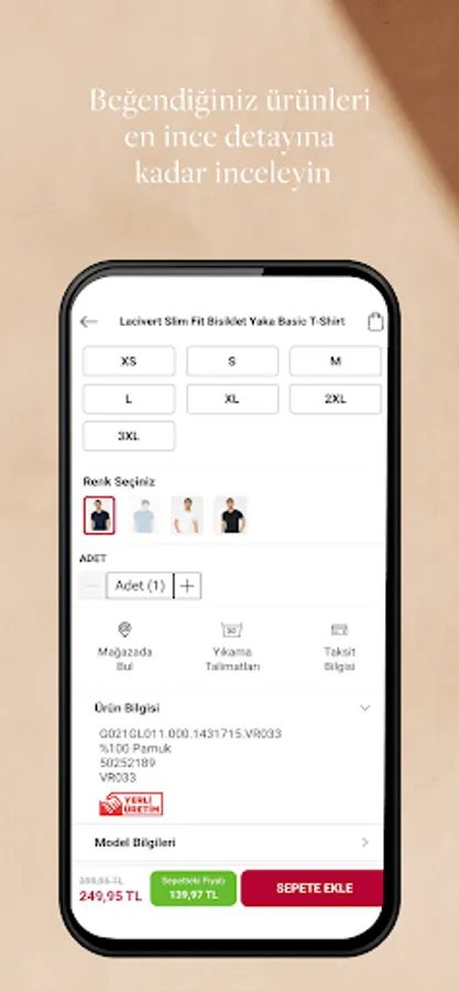 You can examine the products you like in detail, with details such as product content, size information, close-up images, color options and washing instructions.