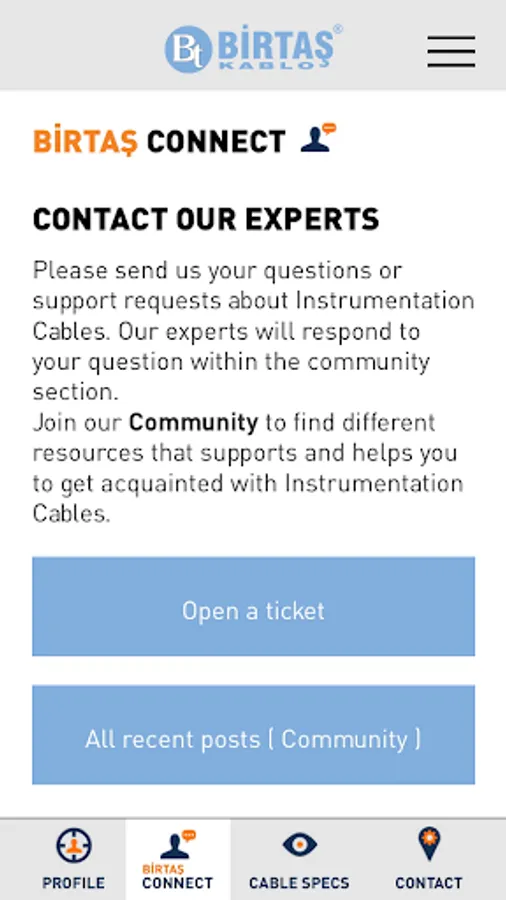 Using “Birtaş CONNECT” you will be able to get in contact with our technical support team. Send us all your questions about Instrumentation Cables and receive answers from our support team directly via this App.