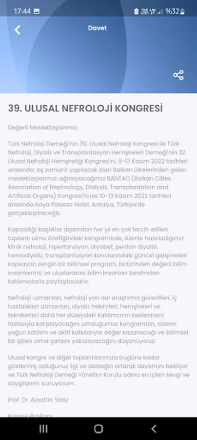 The 39th National Nephrology Congress, which is the most preferred meeting every year in terms of the topics it covers, has a rich scientific program covering the current developments in clinical nephrology, hypertension, diabetes, peritoneal dialysis, hemodialysis, transplantation, which we have carefully prepared, our valuable scientists and international will be shared with the participants by scientists.