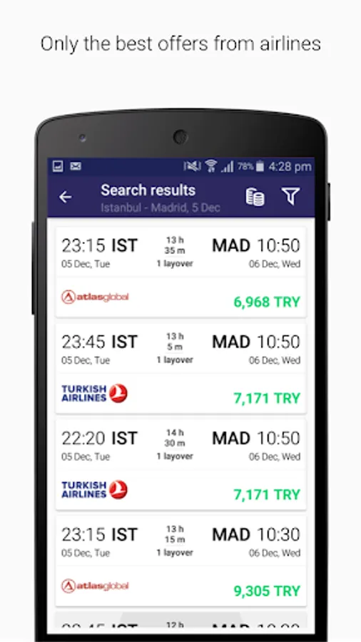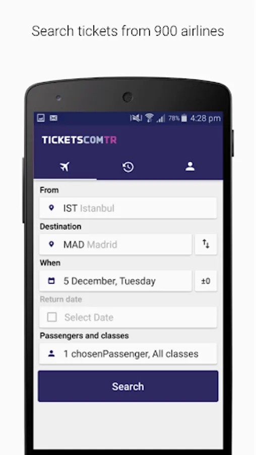 Tickets.com.tr application searches for air tickets from various airlines in different booking systems. As a result, you get the best offers from 900 airline companies: