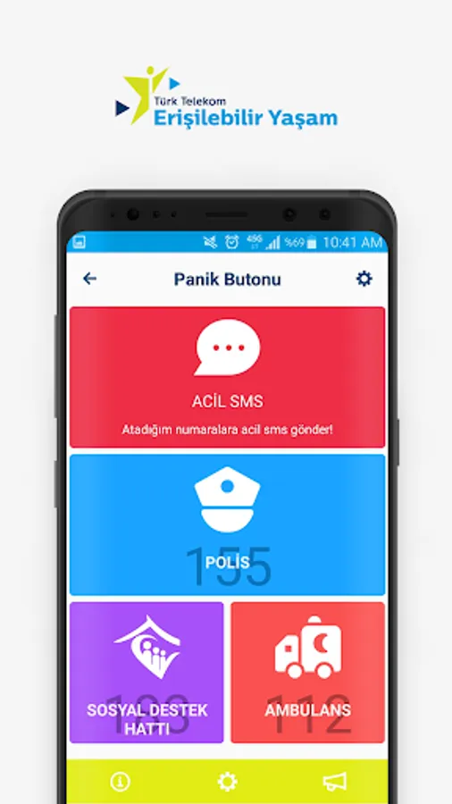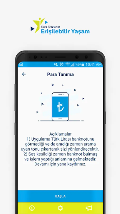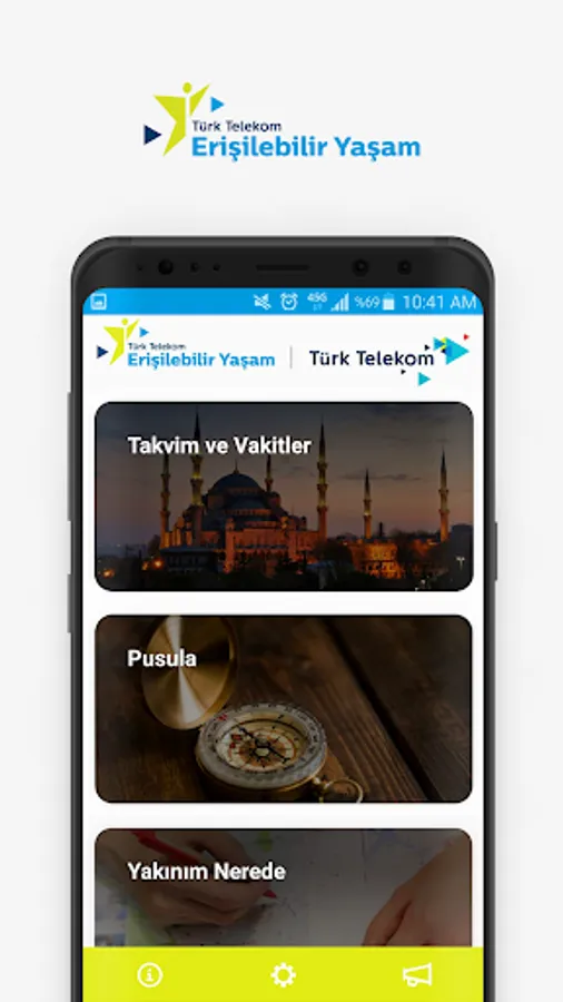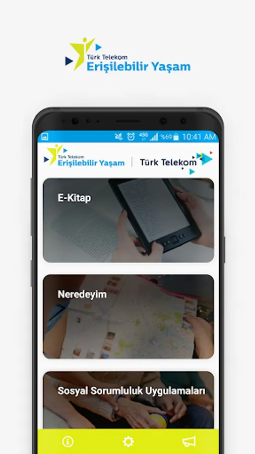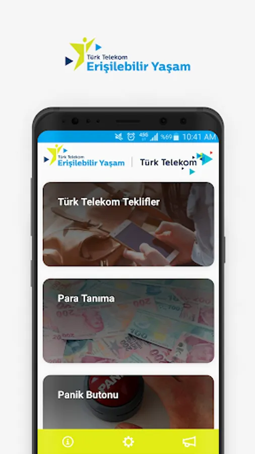 With the basic features we offer within the scope of the application, we aim to stand by the disabled at any time. Money Recognition feature first developed in Turkey in the market without the need for internet connection, shops, played the installments can recognize the Turkish Lira. With the Panic Button, you can notify your predetermined persons in case of emergency and share your location. With the Speak Text feature, you can listen to texts on paper, walls, or objects around you. With Calendar and Times, Compass you can find prayer times, Qibla direction. With Where I'm Near feature you can make real-time tracking of your spouse, children and friends on the map. With E-Book, you can listen to all the documents you have added. Where can I find your location with the map feature, you can share with your loved ones. You can also access all of the Social Responsibility Practices within Türk Telekom.