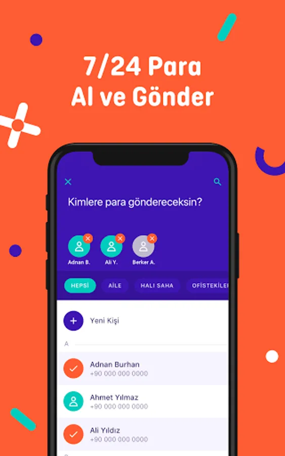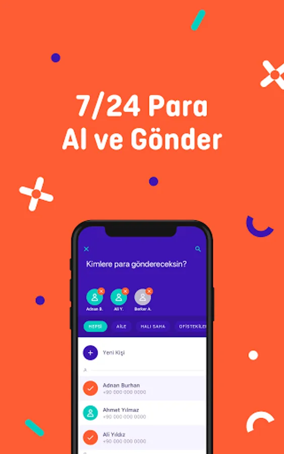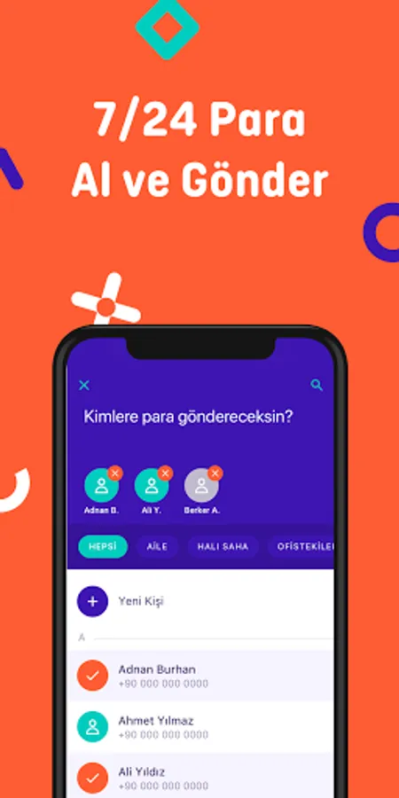 All you have to do for money transfer is to select the person you will send from your directory and determine the amount! Of course completely free!