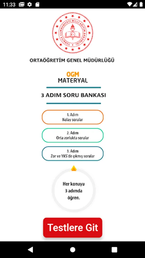 T.R. It is the official 3 Step Question Bank application prepared by the Ministry of National Education, General Directorate of Secondary Education. OGM 3-Step Question Bank online for TYT, AYT and YDT level Turkish Language and Literature, History, Geography, Philosophy Group, Mathematics, Physics, Chemistry, Biology and English courses 1st, 2nd and 3rd step question solutions It is open to all teachers and students. You can access the question booklets at https://ogmmateryal.eba.gov.tr/yks-uc-adim.