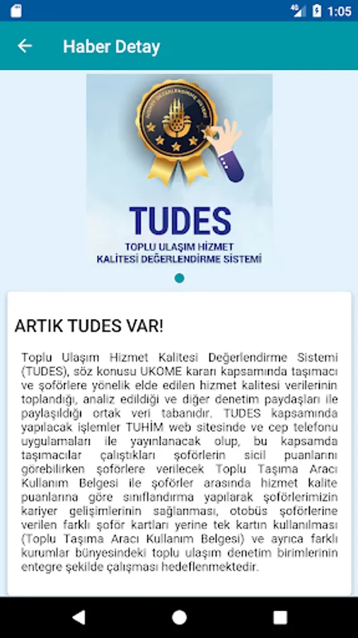 The Public Transportation Quality Assessment System (TUDES) is the common database that collects, analyzes and shares the service quality data for transporters and drivers within the scope of the UKOME decision. Transactions to be made within the scope of TUDES have been made available to smart mobile phone owners and drivers with this mobile application. In this context, the transporters can see the registration documents of the drivers who work and look for work, can follow their service quality score status, send requests / suggestions and fill in questionnaires. The drivers can follow their service quality score status, indicate their job search, send requests / suggestions and fill in questionnaires.