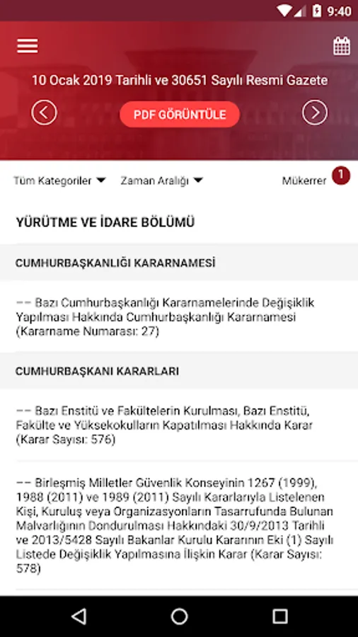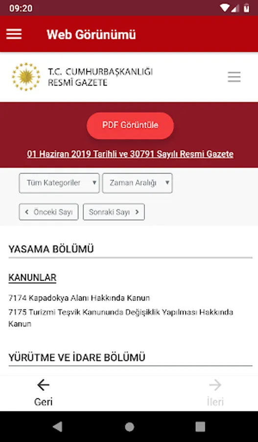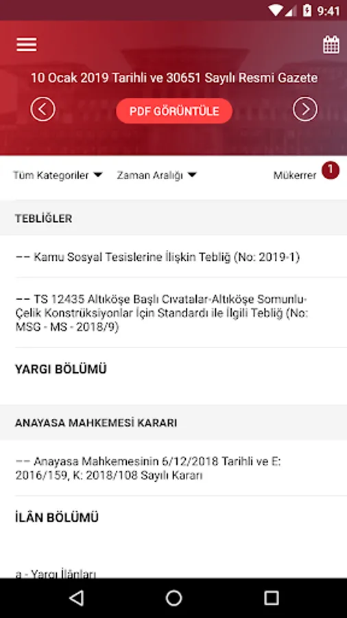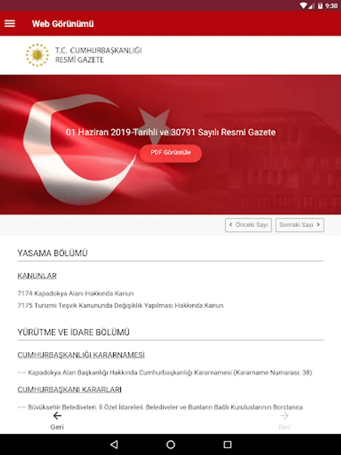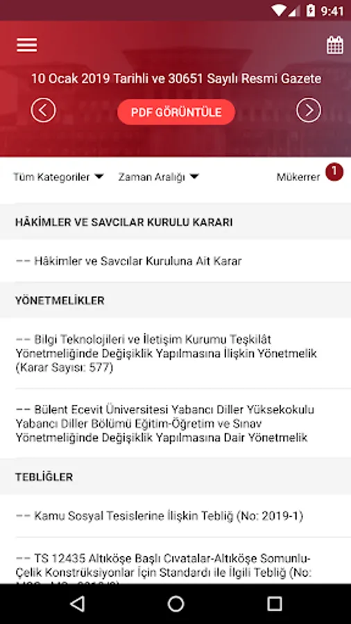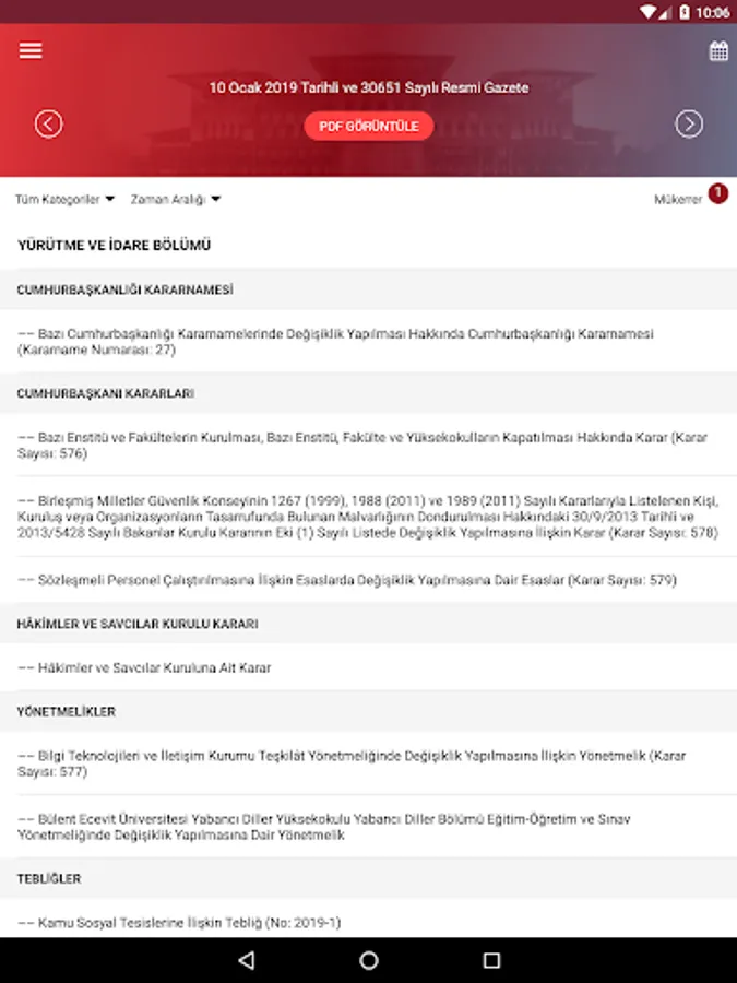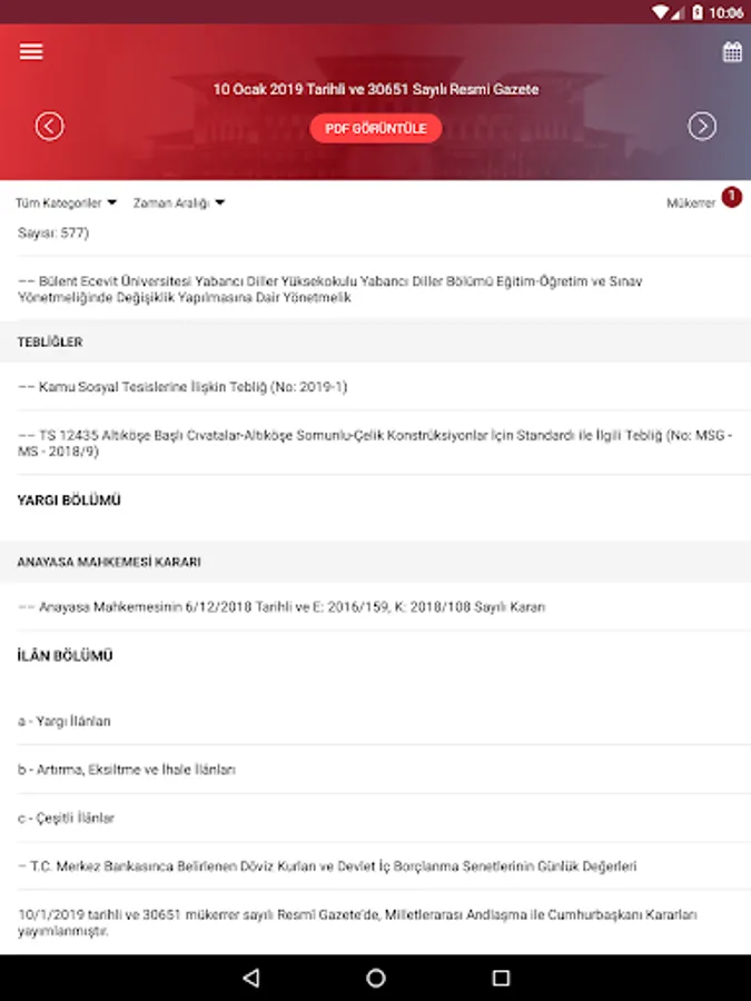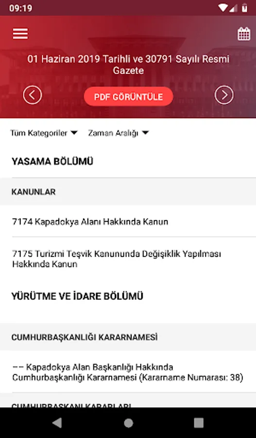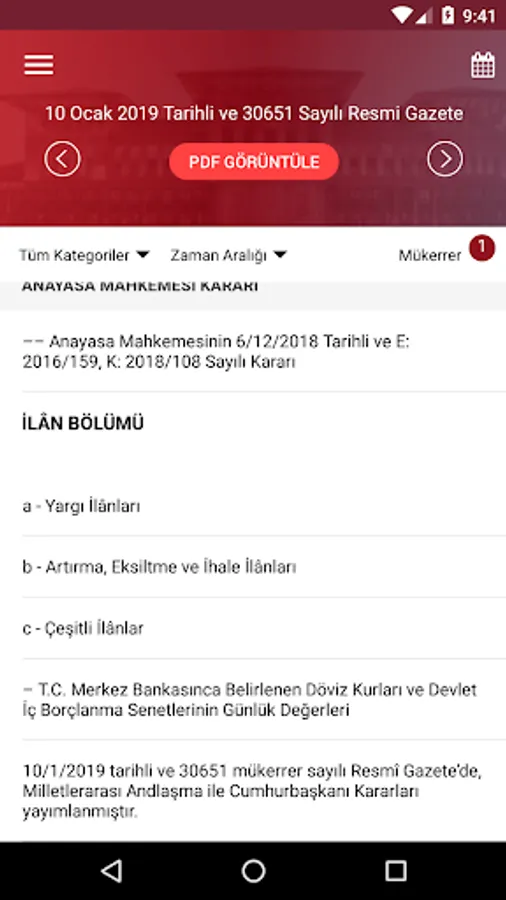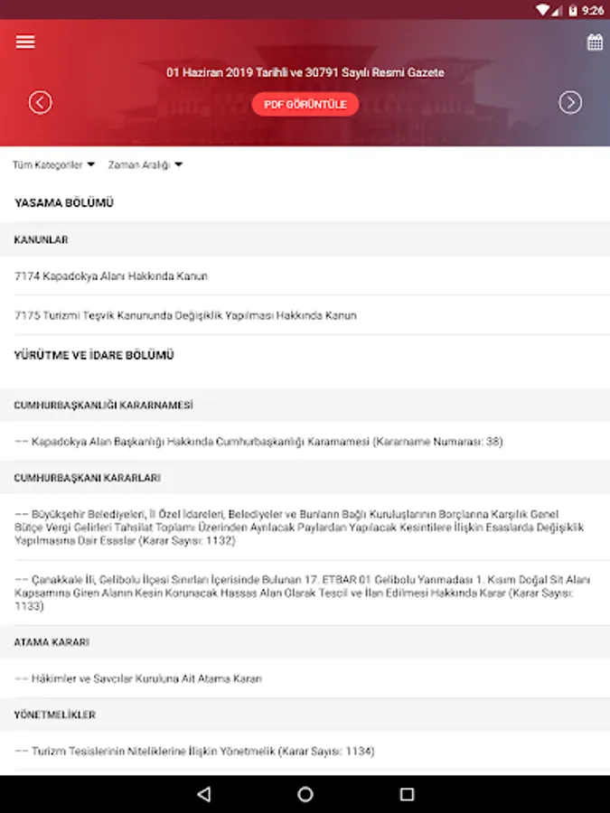 In addition, in the Gazete View PDF ”button in the Official Gazette application, a copy of the Official Gazette published in the current day is available in printable PDF format. By clicking on the day you want to view the calendar section, the content of that Official Gazette can be accessed.
