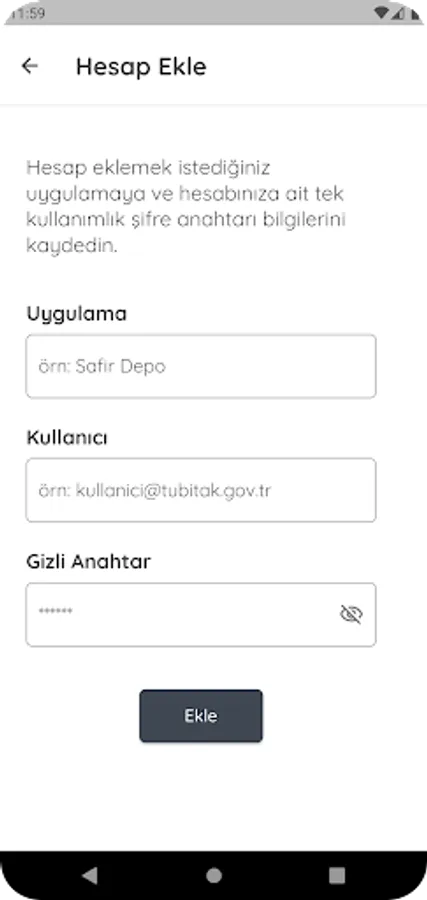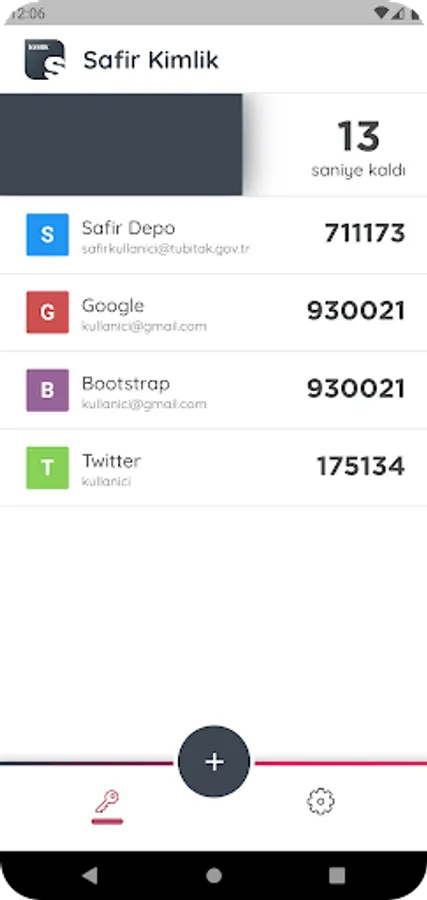 Kullanmakta olduğunuz herhangi bir uygulamaya giriş yaparken, “İki Aşamalı Kimlik Doğrulama”yı aktive ettiğiniz durumlarda ihtiyaç duyacağınız tek kullanımlık şifreleri oluşturmak, bu şifreleri oluşturmak için gereken uygulama anahtarlarını cihazınızda güvenle depolamak için Safir Kimlik uygulamasını kullanabilirsiniz.
